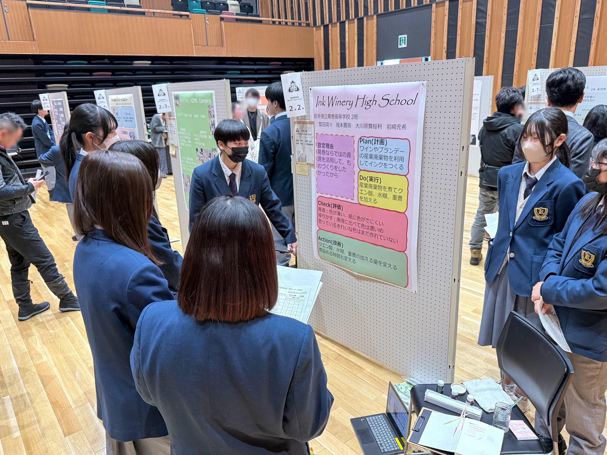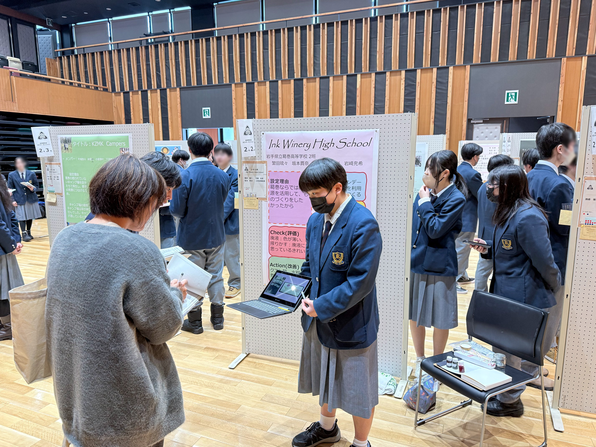 今回のチーム「Ink Winery High School」は、地元葛巻出身の生徒と、全国から集まる「くずまき山村留学」の生徒による混成チームでした。ワインの廃棄物から万年筆インクを作り出すテーマは、過去の先輩が取り組んだ探究学習から継承したものでした。ただ、製造方法などの詳細記録は残っておらず0からのインクづくりに取り組んできたそうです。留学生と地元生の視点が交差することで、廃棄物から「色」という新しいエネルギーを取り出すユニークな挑戦です。