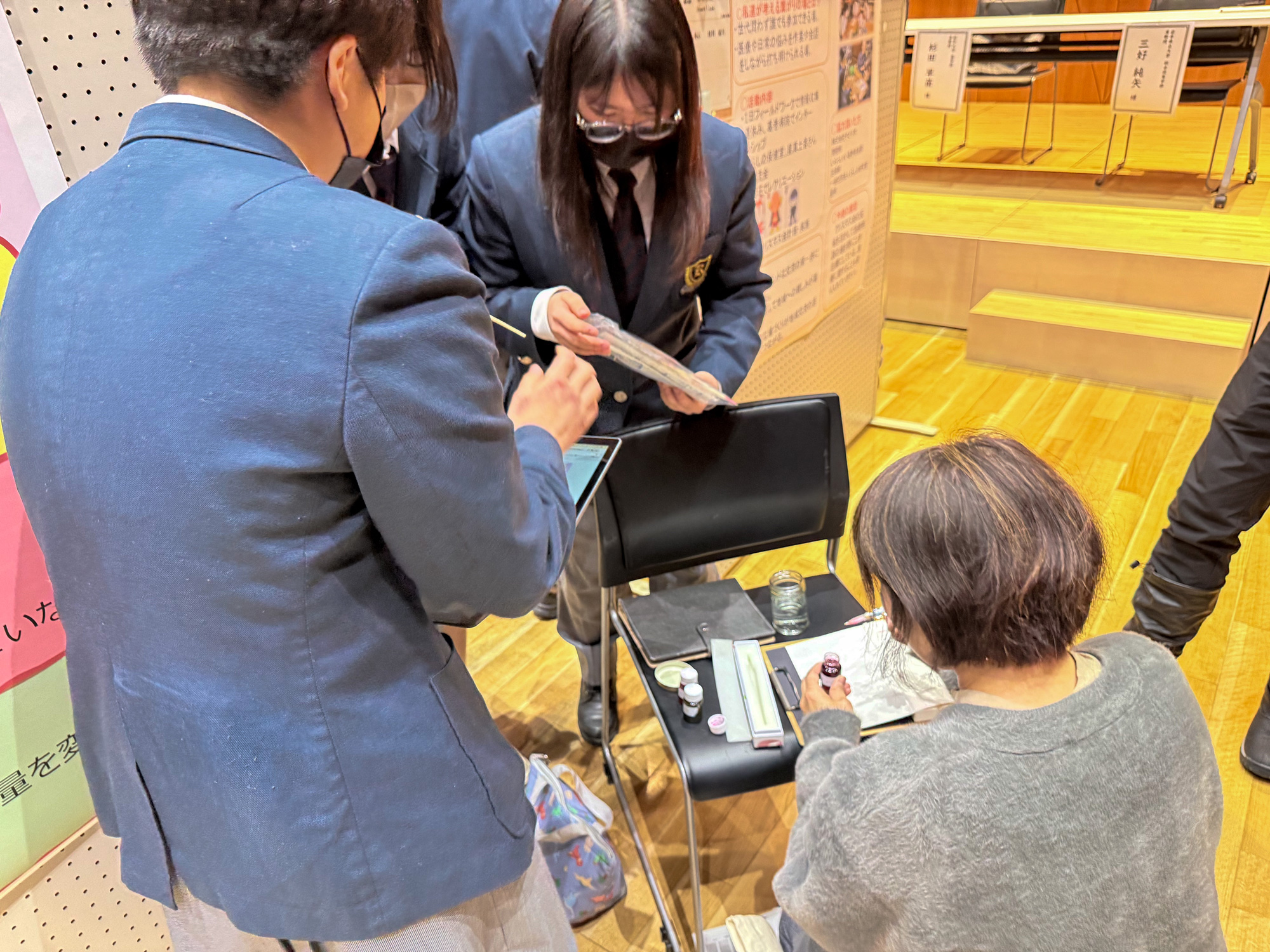 全25班によるポスターセッションの中で、彼らのブースも生徒、大人の熱い視線が向けられていました。ポスター掲示に加え、PCでスライドを見せながらのプレゼン。そして何より来場者の目を釘付けにしたのは、改良を重ねたインクによる「試し書き」体験でした。