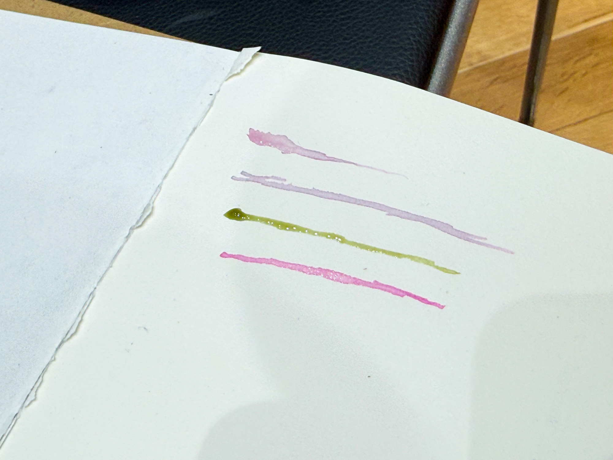 実際のインクは、鮮やかなピンク、落ち着きのある紫、フレッシュなオリーブの3色が作られていました。材料は、ワインの廃棄物で同じもを使っていますが、クエン酸、水糊、重曹の分量で3色を作り分けたそうです。