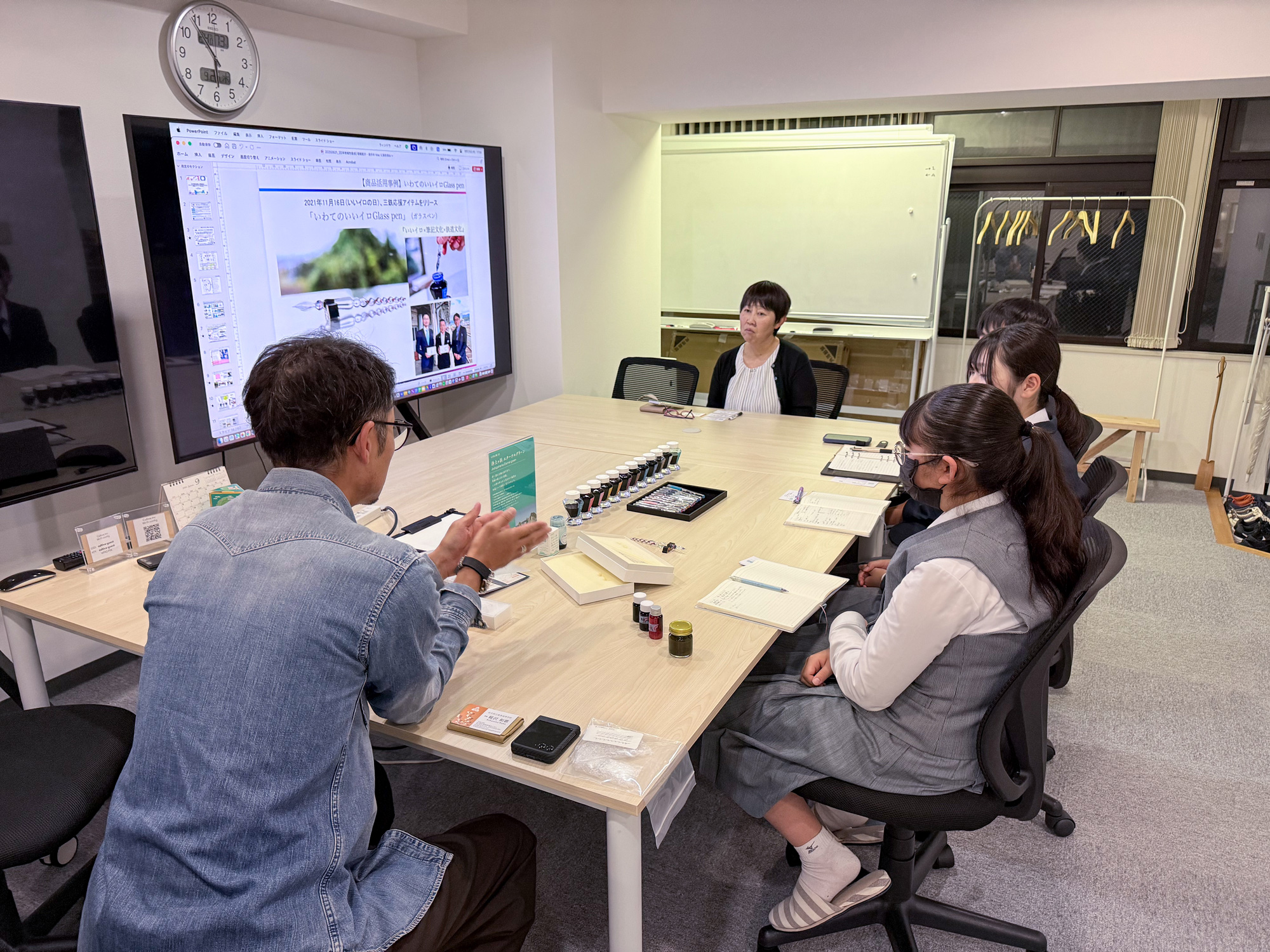 この日の検証には、当協会と共に「いわてのいいイロCOLOR INK」を育ててきたオリジナル文具の販売とプロデュース「pen.」の菊池保宏氏にも同席してもらいました。プロの視点によるフィードバックは、生徒たちにとって実現の難しさを知るものでした。