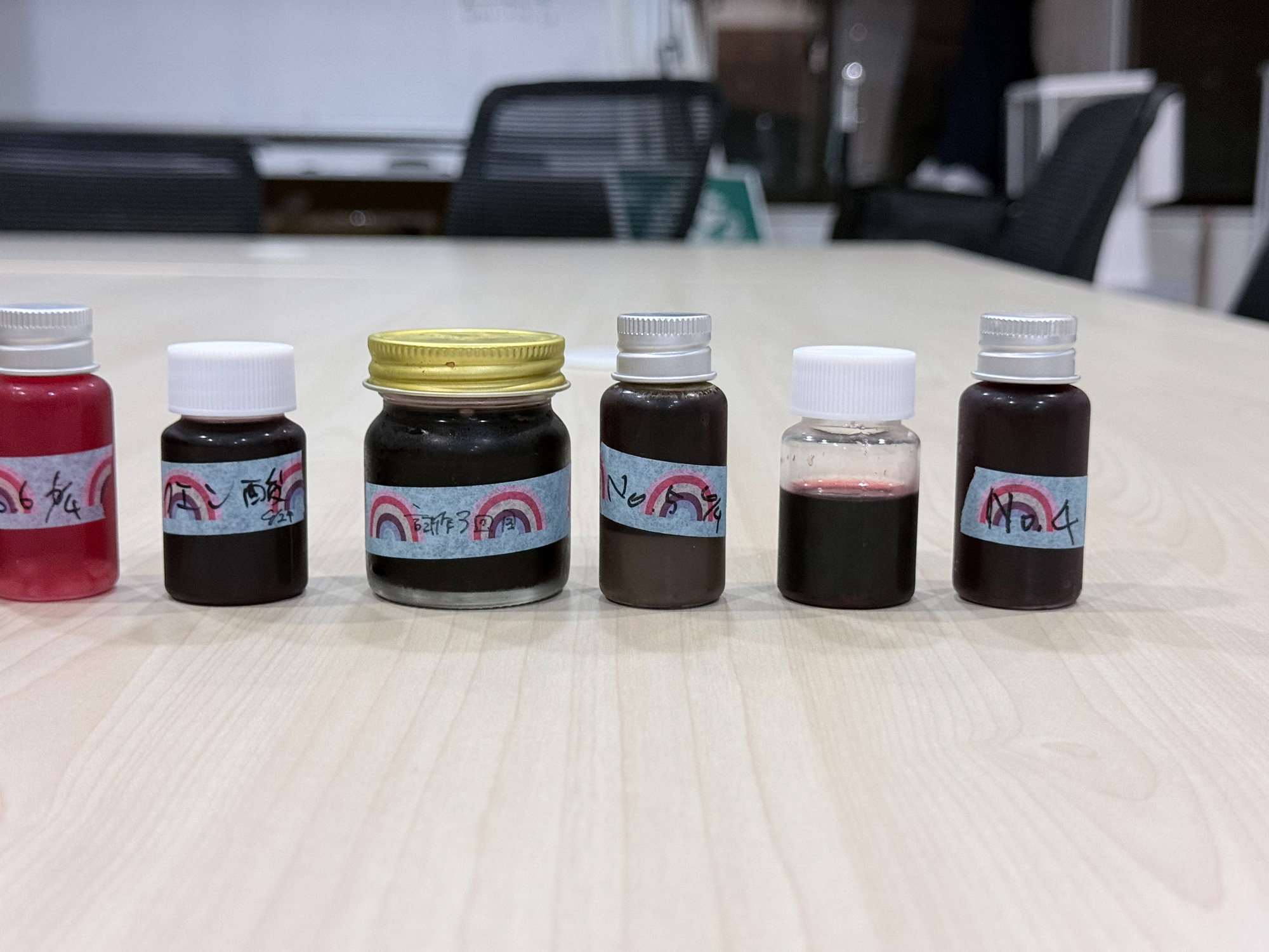 2025年9月、彼らが事務所に持参した最初の試作品は、ブランデーの残液を利用したものでした。9本の試作をそれぞれ試し書きしました。